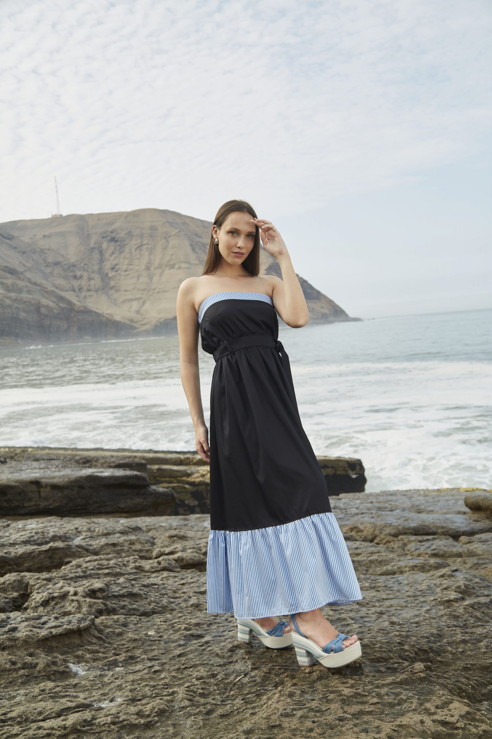 Halter dress NITA azul con rayas pecho baby blue