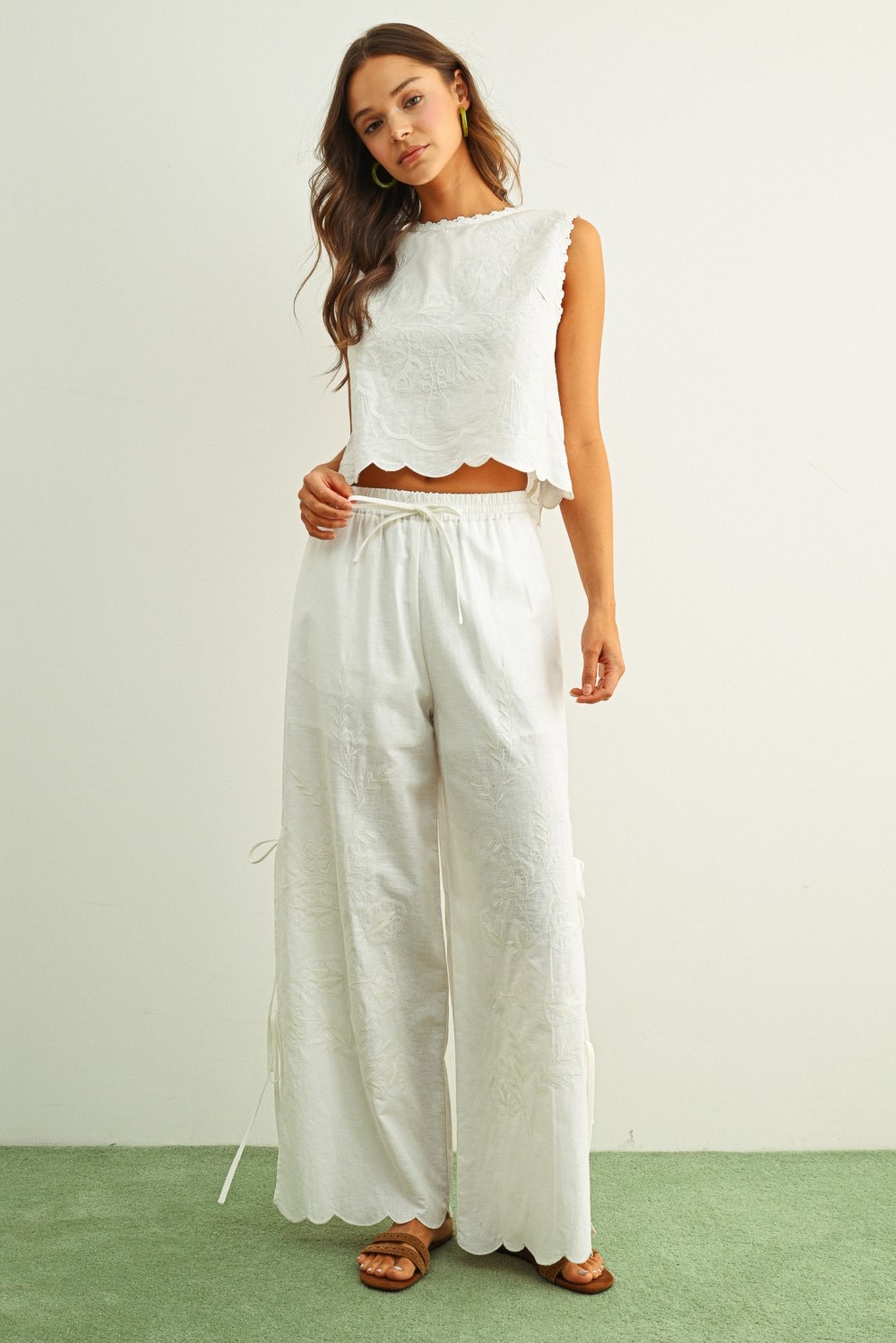 Set Top y pantalon off white lino algodón flores sobre estampadas